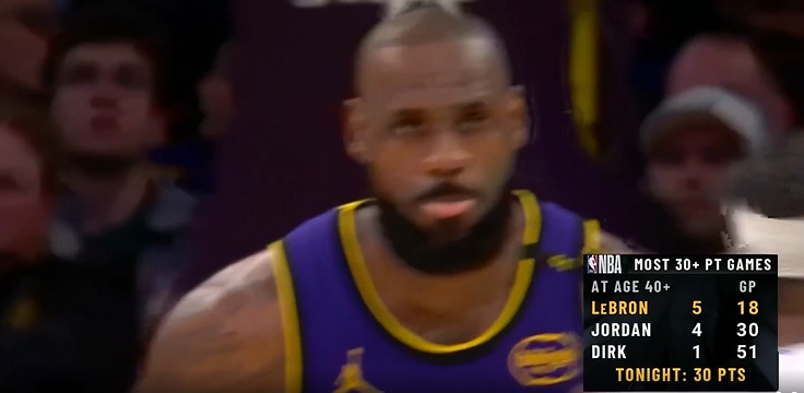 40歲之后詹姆斯已經(jīng)砍下5次30+排名歷史第一,是其他人之和(喬丹4次+諾維茨基1次),值得一提的是,詹姆斯40歲之后還只打了18場(chǎng)比賽。