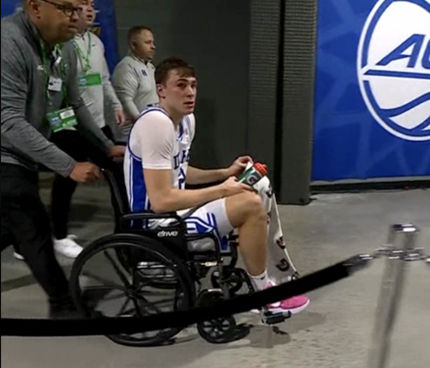 3月14日,ACC分區(qū)錦標賽1/4決賽,杜克大學對陣佐治亞理工學院上半場,弗拉格在搶籃板落地時踩到對手恩東戈的腳上扭傷腳踝,他起身后被攙扶著走到場邊,之后坐著輪椅離場,在接受檢查之后自行走回球隊替補席,下半場沒有出戰(zhàn)。