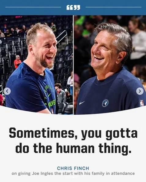 事實上芬奇也是當天早上才決定這樣做的。有人跟他說,如果森林狼能夠在今晚的比賽中取得大比分領先,在大局已定的情況下讓英格爾斯上場會顯得很酷,既是對英格爾斯和他兒子的鼓勵,也有助于凝聚球隊的士氣。