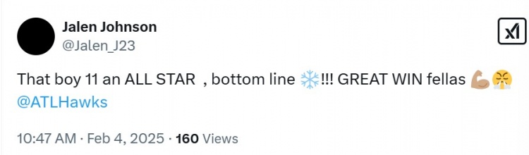 賽后,老鷹前鋒杰倫-約翰遜更推道:“那個11號男孩是全明星,最差都應該是?。。》浅0舻膭倮???????????? ?!?/p>