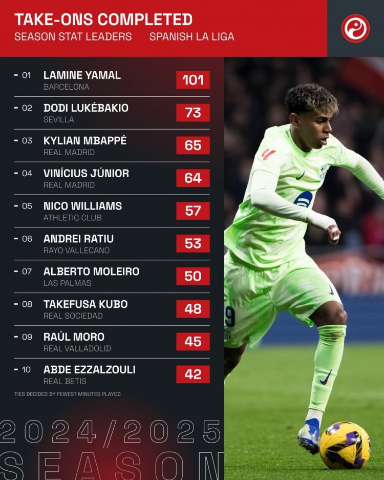 本賽季西甲成功過人榜:亞馬爾斷崖領(lǐng)跑,姆巴佩、維尼修斯在列