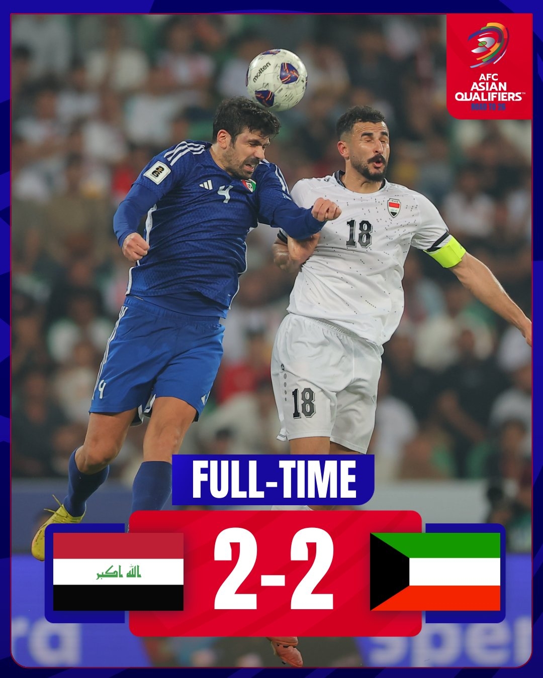 3月21日訊 在本輪世預(yù)賽亞洲區(qū)比賽中,伊拉克2-2戰(zhàn)平科威特。