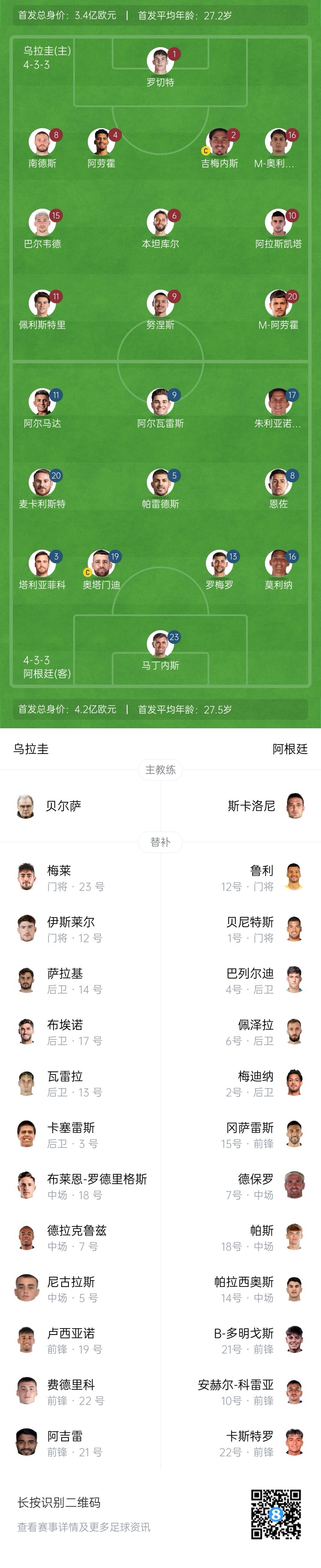 阿根廷替補(bǔ):12-魯利、1-瓦爾特-貝尼特斯、2-梅迪納、4-巴列爾迪、6-佩澤拉、7-德保羅、10-科雷亞、14-帕拉西奧斯、15-尼古拉斯-岡薩雷斯、18-帕斯、21-多明戈斯、22-卡斯特羅