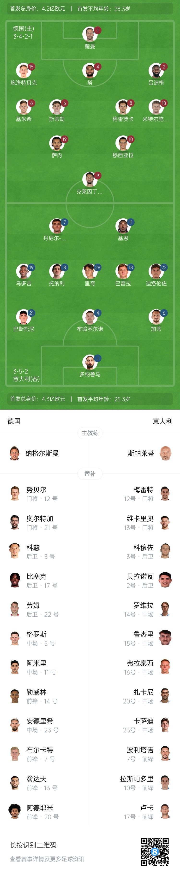 3月24日訊 歐國聯1/4決賽次回合,德國vs意大利首發(fā)出爐。陣容更新中。首回合對陣,德國2-1意大利。
