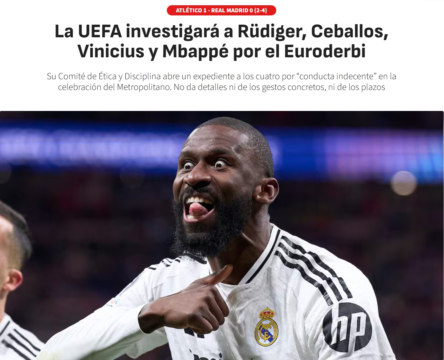 據(jù)此前報(bào)道,在皇馬vs馬競(jìng)次回合比賽后,馬競(jìng)方面向歐足聯(lián)提交了四段視頻,指控皇馬球員的不當(dāng)行為。其中包括:呂迪格對(duì)馬競(jìng)球迷做出抹脖子手勢(shì)、維尼修斯多次挑釁觀眾、塞巴略斯進(jìn)入球員通道時(shí)做出粗魯手勢(shì),以及姆巴佩面對(duì)馬競(jìng)球迷觸摸自己隱私部位。