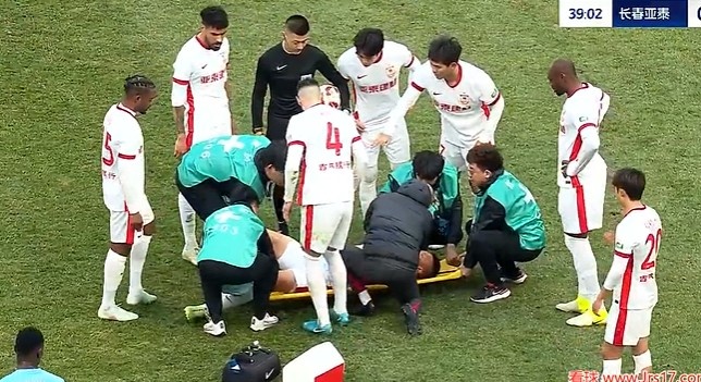 第38分鐘,譚龍拼搶中受傷倒地被擔架抬出場外,同時李申圓受傷堅持不住回更衣室?!?/p>