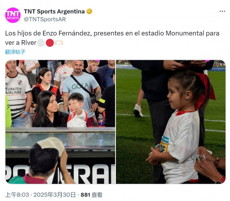 瓦倫蒂娜帶著孩子們來(lái)到紀(jì)念碑球場(chǎng),現(xiàn)場(chǎng)觀看河床隊(duì)的比賽。恩佐出身于河床青訓(xùn),他與瓦倫蒂娜去年曾分手,兩人今年1月份宣布復(fù)合。