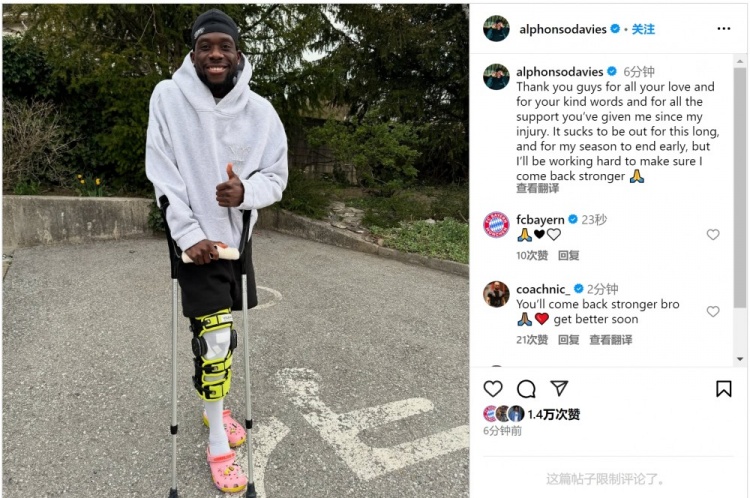 3月31日訊 拜仁后衛(wèi)戴維斯更新社媒動(dòng)態(tài),感謝球迷對(duì)他的支持和祝福,并確認(rèn)賽季報(bào)銷。