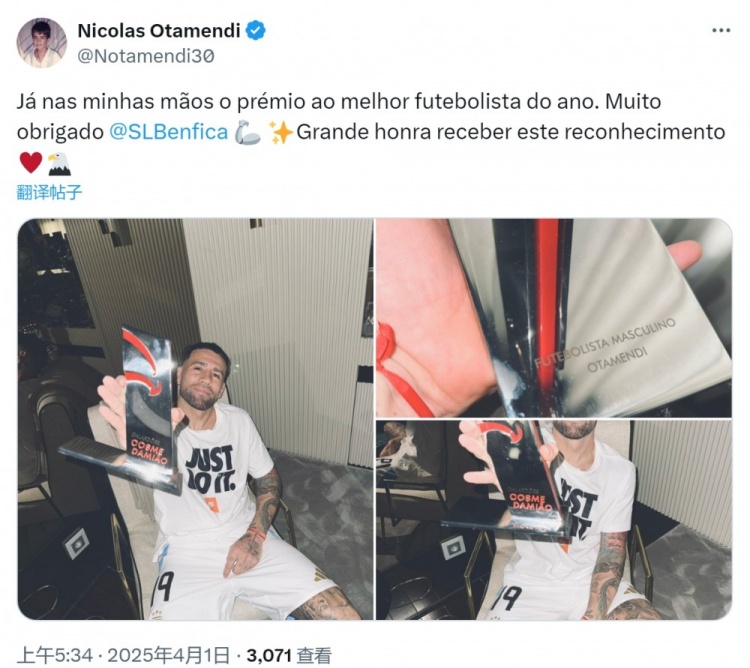 奧塔門迪今日在社交媒體上曬出手拿獎杯的照片,并配文:“年度最佳球員獎杯已經(jīng)在我手中,非常感謝本菲卡,很榮幸獲得這一認可?!?/p>