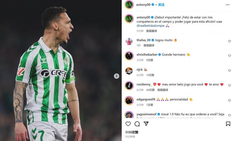 安東尼也在賽后通過社媒曬出慶祝照并配文:“關(guān)鍵的處子秀!很高興能夠和隊友們一起為眼前的球迷們奮戰(zhàn)。”