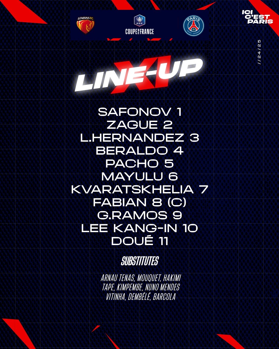 39-薩福諾夫、42-扎格、21-盧卡斯-埃爾南德斯、35-貝拉爾多、51-帕喬、24-馬尤盧、7-克瓦拉茨赫利亞、8-法比安-魯伊斯、9-貢薩洛-拉莫斯、19-李剛仁、14-杜埃