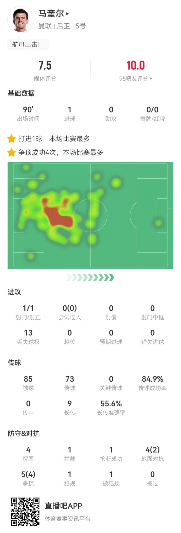 卓越!馬奎爾本場(chǎng)1球+4解圍 9對(duì)抗6成功 9長(zhǎng)傳5成功 獲評(píng)7.5分