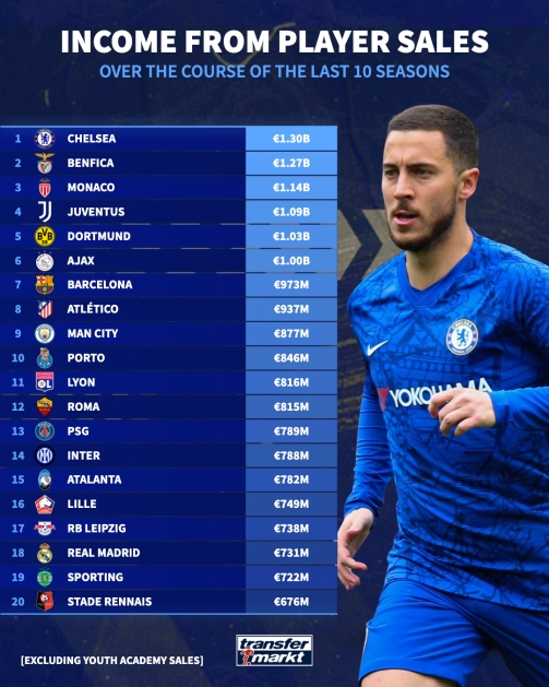 近10年賣(mài)人收入榜:第一切爾西13億歐力壓兩黑店,巴薩第7曼城第9